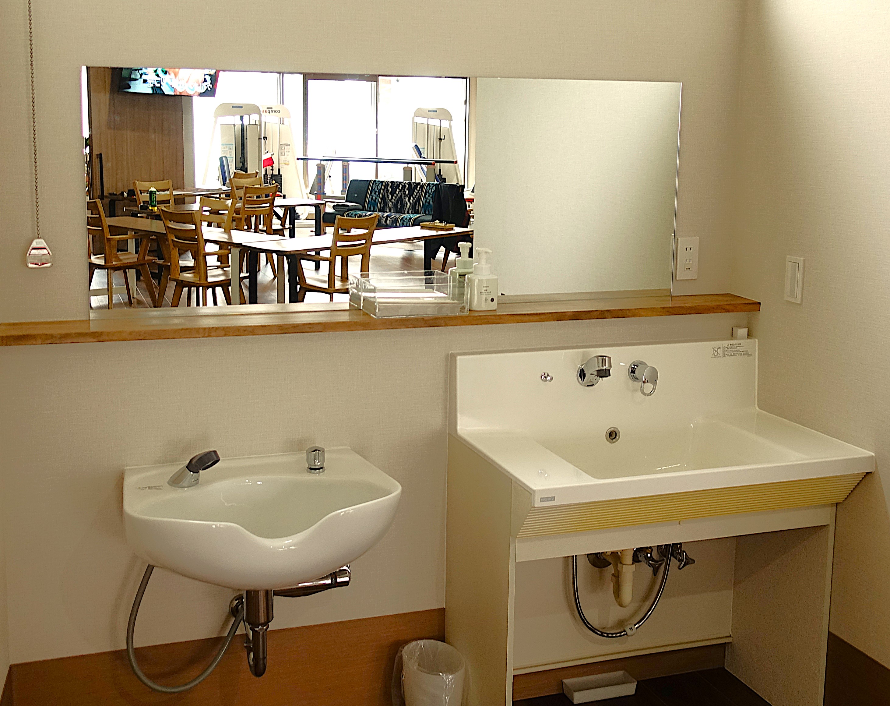 - 大きい鏡が特徴的な洗面所です。食事のあとは歯磨きを行っていただき、口腔ケアも行います。