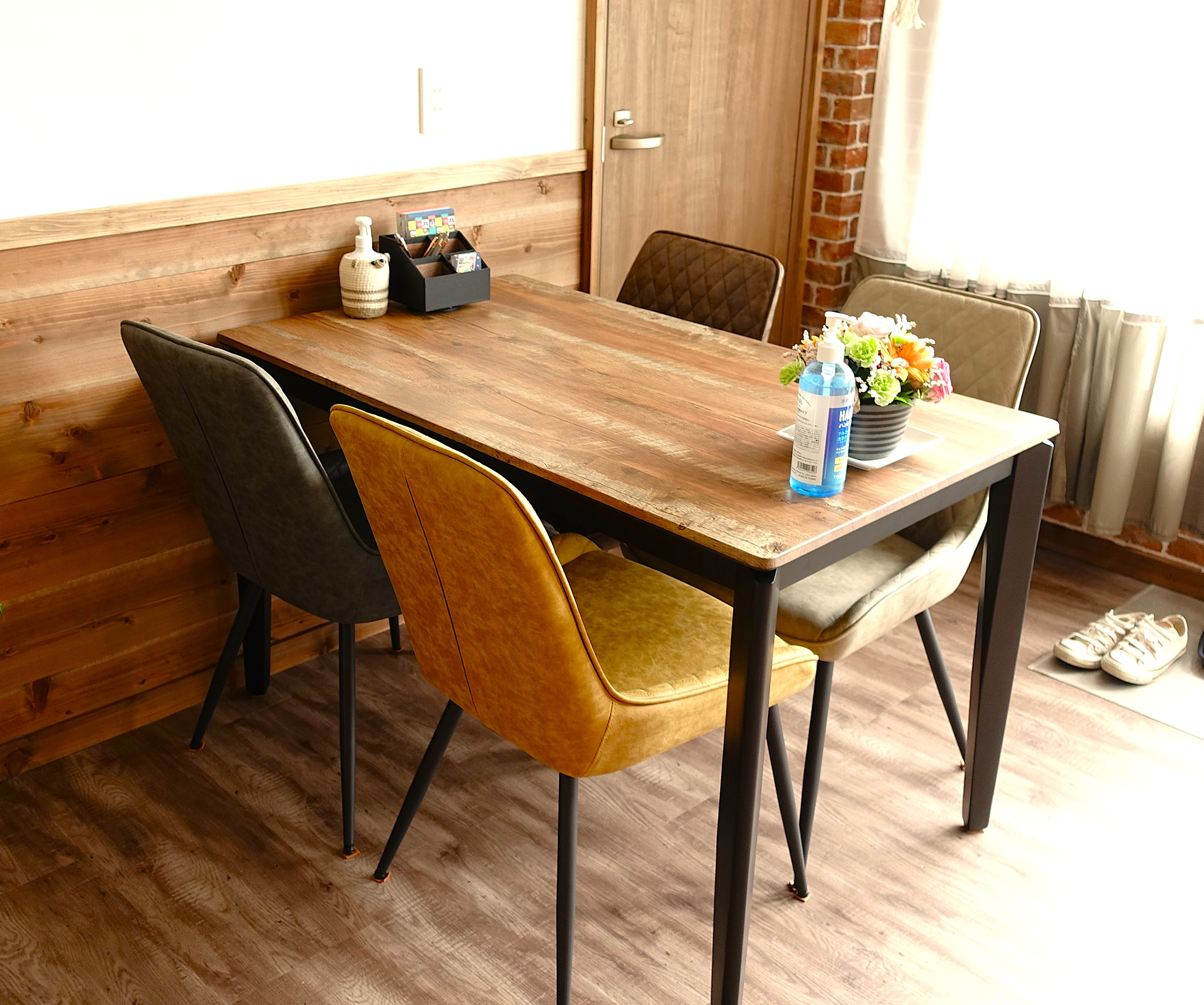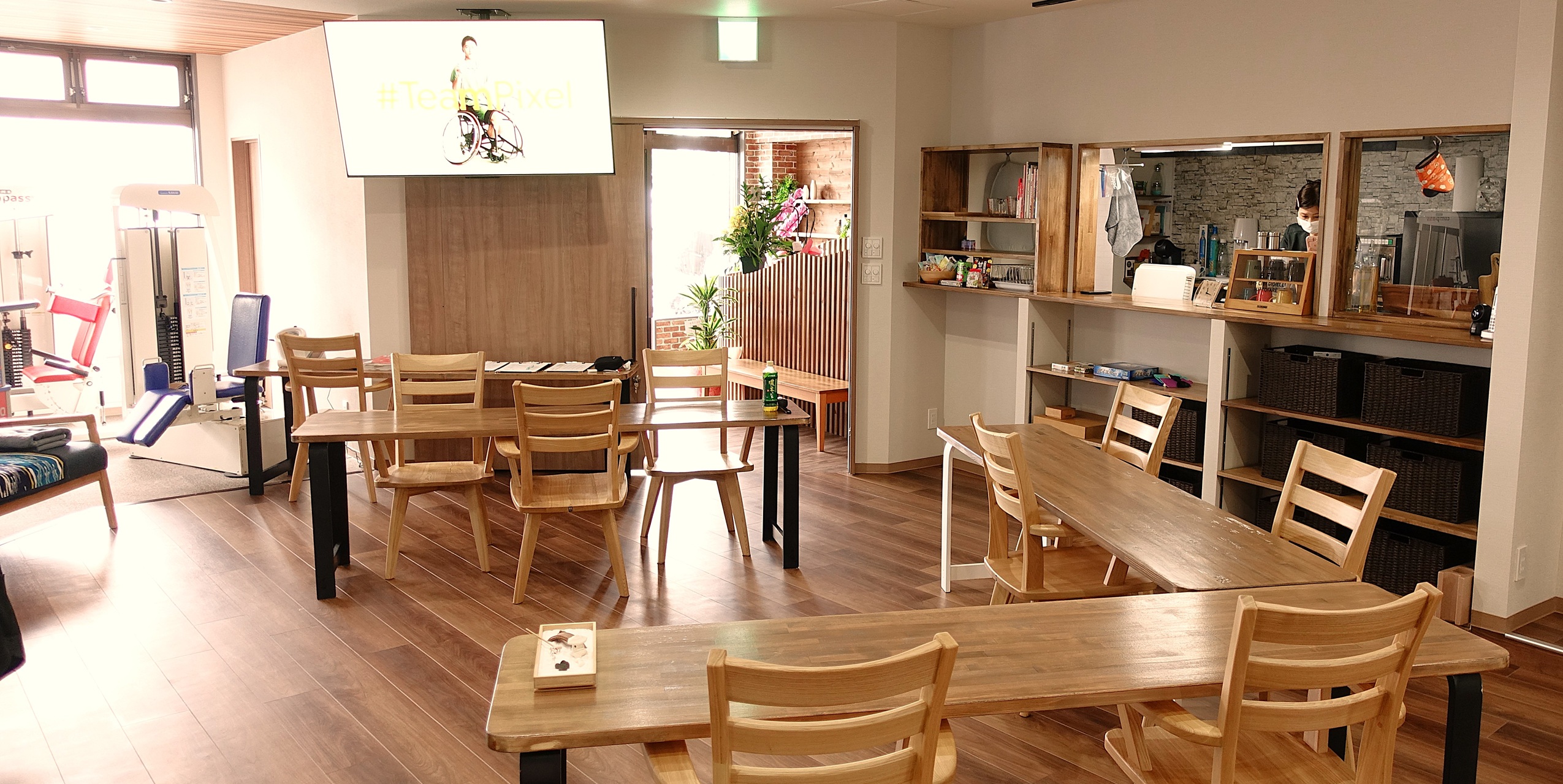 - このスペースは相談スペース兼カフェスペースとなっています。ちょっとカフェ気分を味わいたい人がゆっくりできる空間になっています。相談者さまやご利用者さまのご家族の方などが訪問されたときなどは、カーテンで仕切れるようになっていて、プライバシーにも配慮した空間を作りました。
