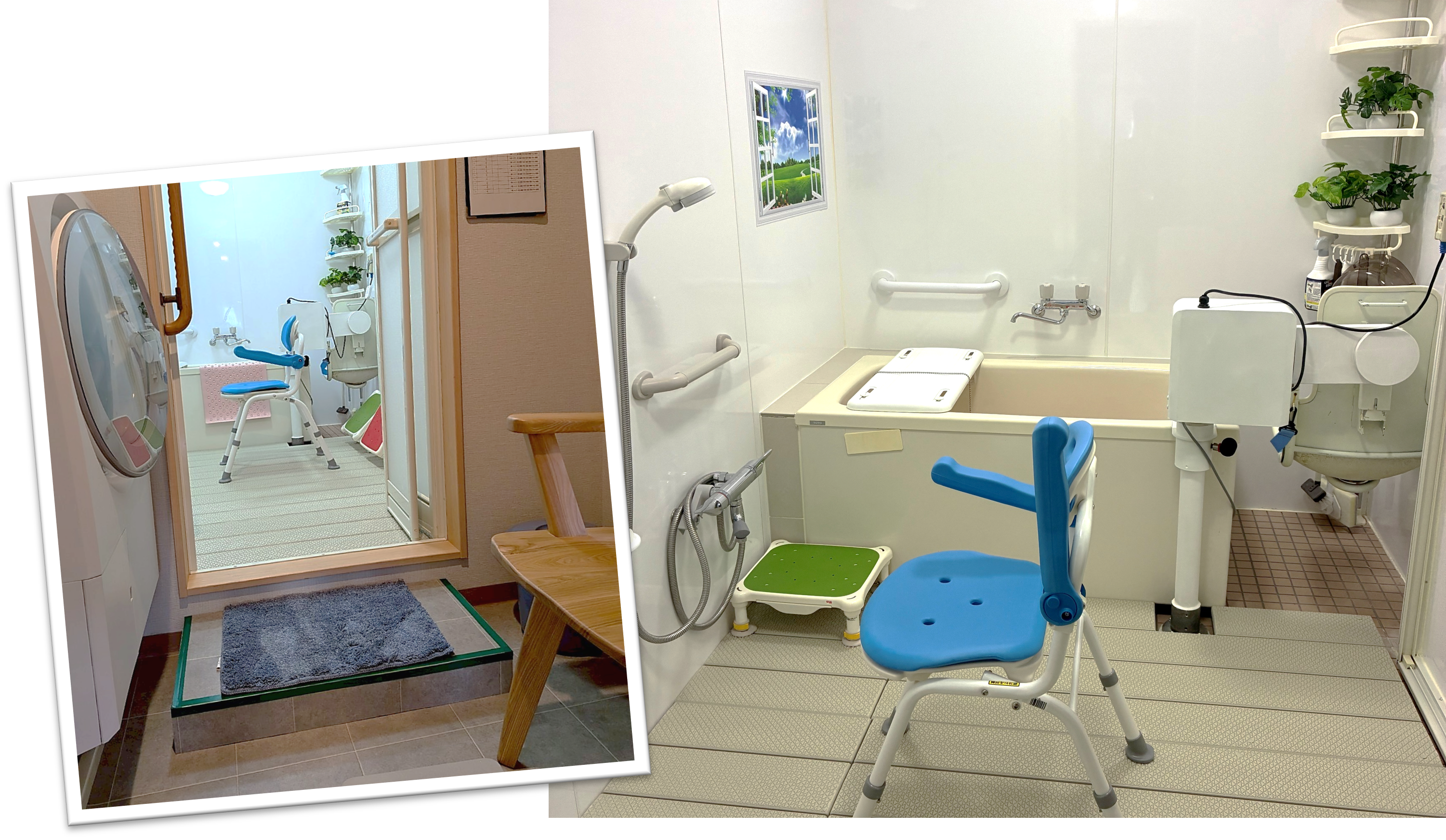 - お風呂は自宅でのお風呂にも入れるよう、あえて、バリアフリーにはしていません。お風呂はもちろん個別入浴です。おひとりでも補助付きでもどちらでも選べます。浴槽には器具を取り付けているので、安全に湯舟につかることができます♪