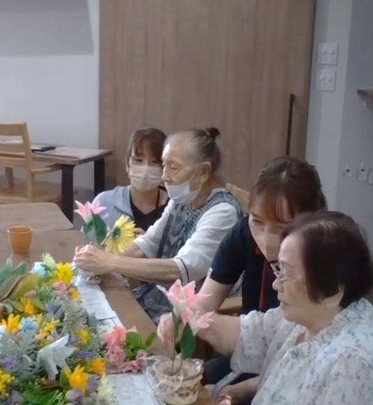 - 基本的にはみんなで一緒にご飯を食べますが、場所に指定はありません♪お好きなところで食べていただけます♪机が分かれているので、イベント時にはくっつけたりして、お菓子を作ったり、生け花をしたりするときもあります。隣には、すぐナースステーションがあり、常に全体が見渡せるようにしています。