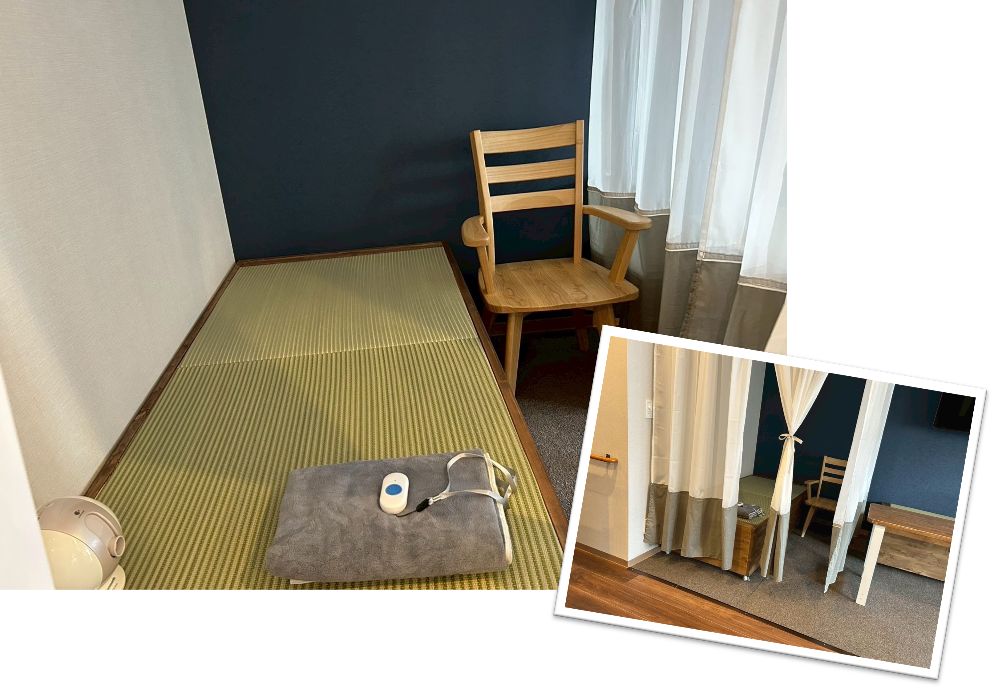 - 畳は1畳ほどの畳が2個あり、くっつけたり、別で使用したりできるようになっています。トランプをしたり、ゴロゴロしたり、ここでは自由に過ごして頂けます。少し体調が悪い人がいた時は静養室のベッドとして活用でき、カーテンで仕切ることが出来ます。実は、カーテンも手作りしています♪