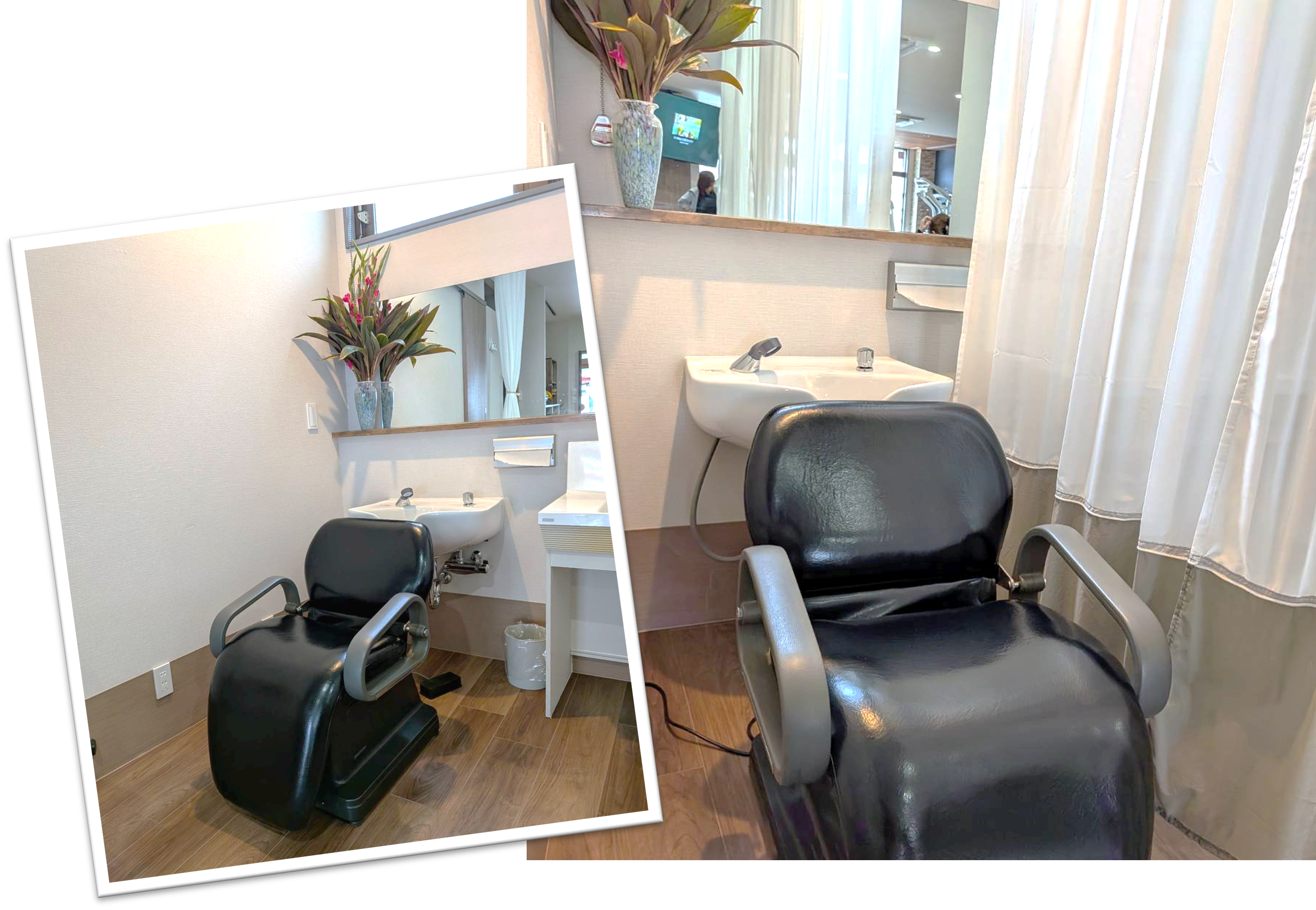 - こちらでは、美容師さんにきていただいたときに予約制(有料)で髪を切ったり、セットするスペースを設けています♪。お風呂に入れない人などもここで洗髪することもできます。シャンプー椅子を活用して、足のマッサージや手のマッサージなどもする予定です♪